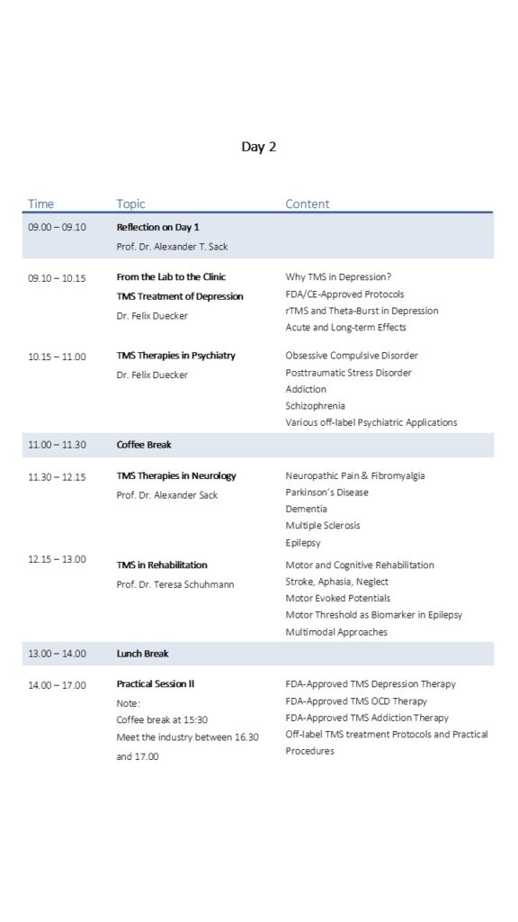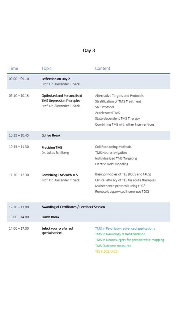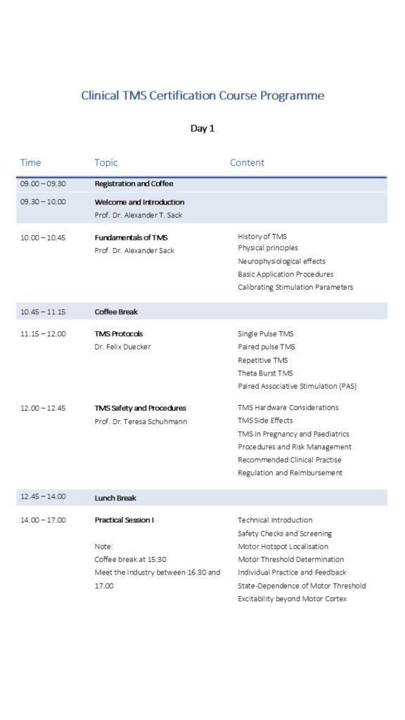 - 3 full days of lectures and intensive hands-on trainings by internationally renowned TMS experts from the Academy of Brain Stimulation representing various prestigious academic and clinical institutes